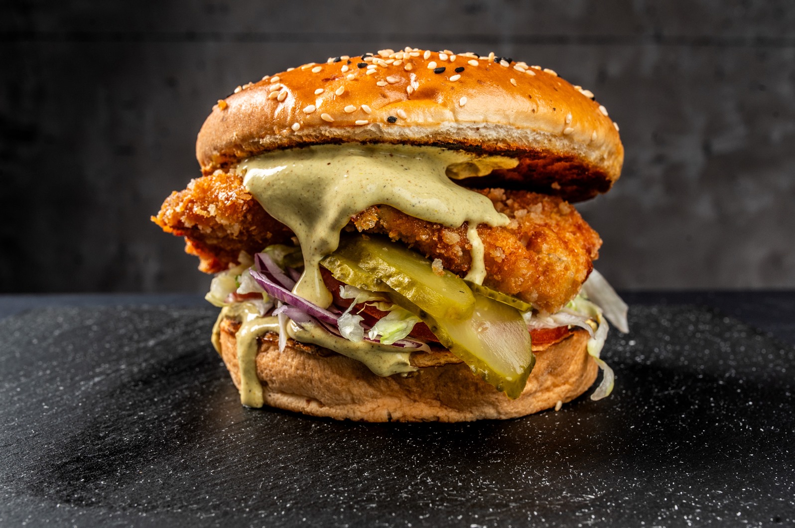 Brioche bun, panko Crispy chicken filet, curry sauce, pickles, tomato, iceberg, red onions